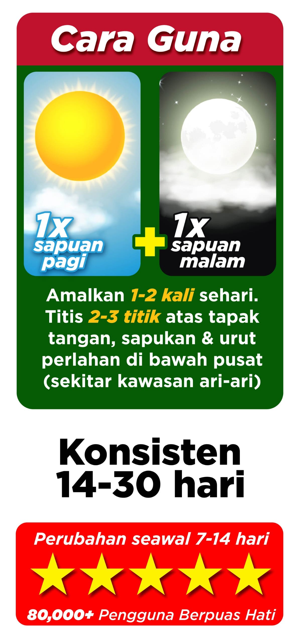 Titiskan 2–3 titik minyak di tapak tangan. Sapu di bawah pusat (sekitar kawasan ari-ari). Urut secara perlahan ke arah bawah, ke bahagian kemaluan & sekitar pangkal alat sulit. Lakukan 1–2 kali sehari – sebaiknya waktu pagi selepas mandi & malam sebelum tidur.